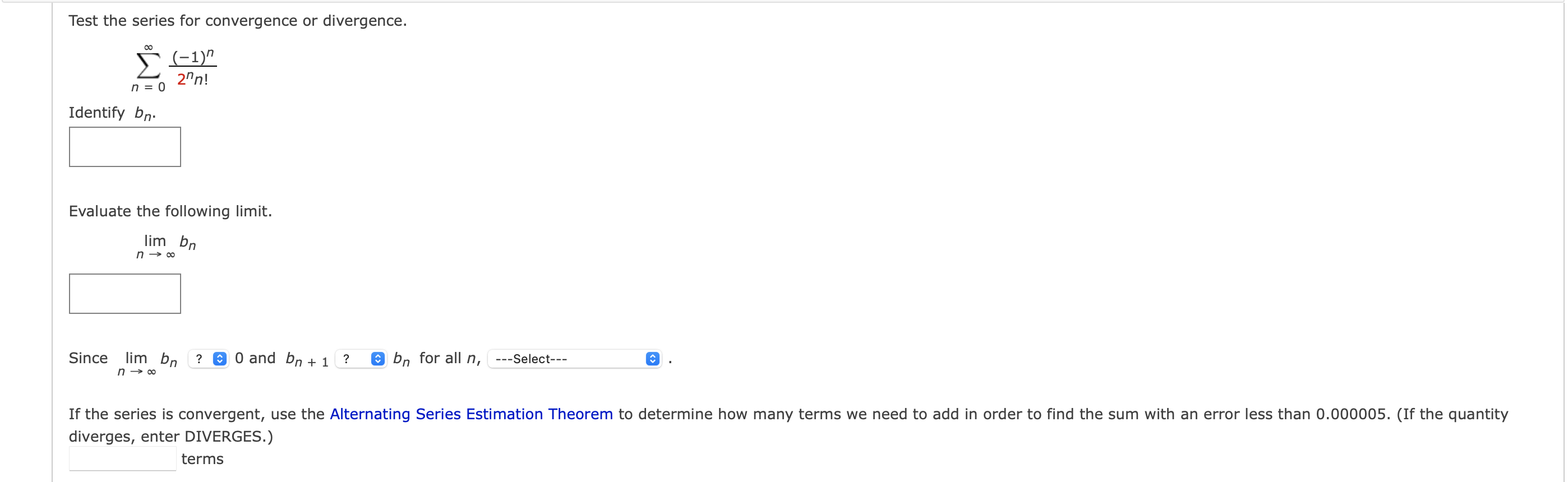 O and bn 1. ---Select- If the series is convergent use the Altemating Series Estimation Theorem to determine how many terms we need to add in order to find the sum with an error less than 0000005. And 0 decreasing ๐1 ๐ lim ๐ ๐0 or if ๐ ๐0 is convergent Condition of Divergence.