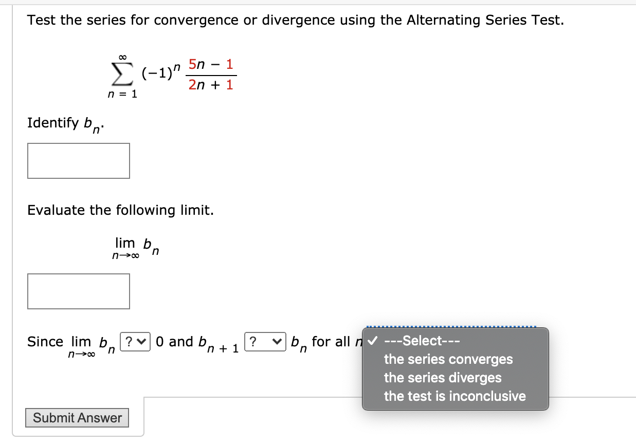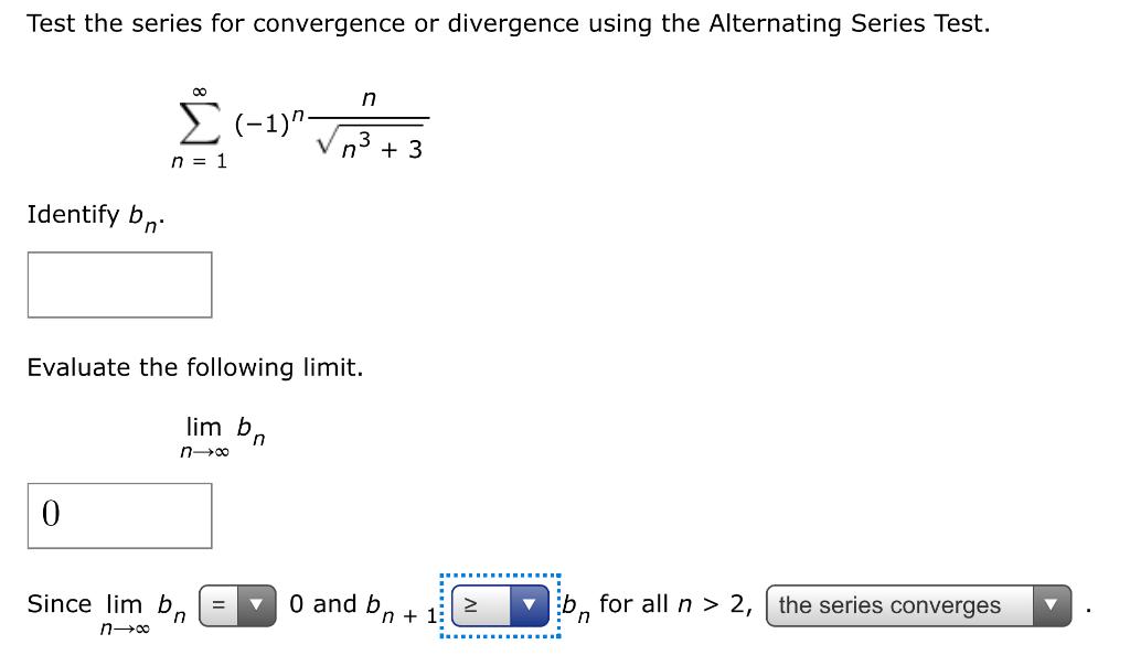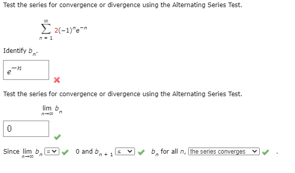 Test the series for convergence or divergence. If the series a n a n converges then the series a n a n also converges. Test the series for convergence or divergence using the Alternating Series Test.