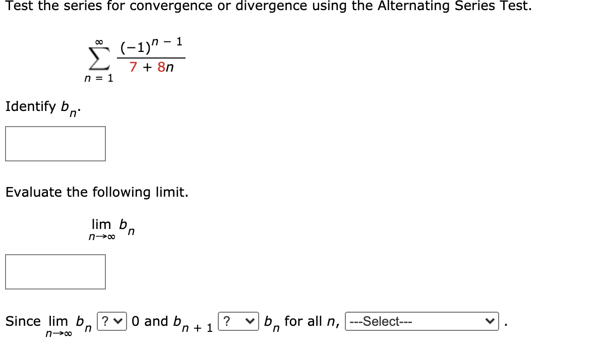 00 ฮฃฮฟ e- 6 -1e-n n 1 Identify bo Test the series for convergence or divergence using the Alternating Series Test. ๐ ๐1 5 Integral Test Series. N n200 b for all ni --Select--- --Select- the series converges the series.