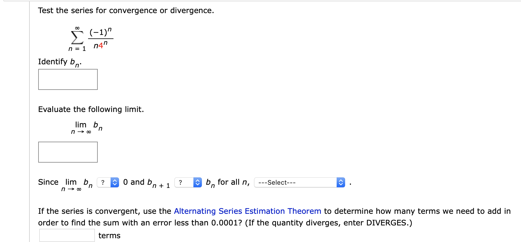Lim bn n- 00 0 Since lim bn O and bn 1 bn for all n the series is convergent n - 00 If the series is convergent use the Alternating Series Estimation Theorem to determine how many terms we need. If a series diverges then the terms do not get smaller as n gets larger. If the value received is finite number then the series is converged.